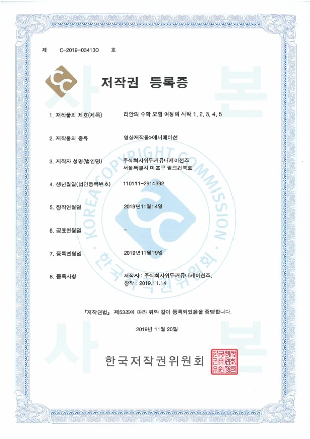 [한국/저작권] 리안의 수학 모험 여정의 시작 1,2,3,4,5 페이지 정보 작성자 WeDu 댓글 0건 조회 6,350회 작성일 21-12-31 12:36 본문 2019-11-20 저작권 C-2019-034130 영상저작물>애니메이션 List Previous[한국/저작권] OLL KIDS/MATH 21.12.31 Next[한국/저작권] 리안의 수학 모험 애니메이션 OST 19.11.25